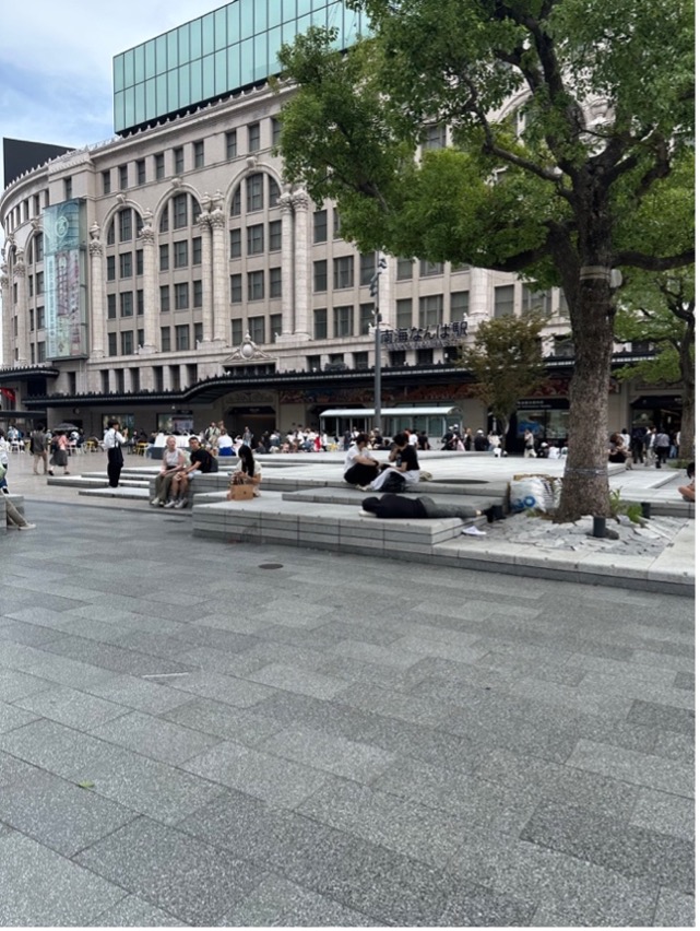 日曜日のお昼頃に見学を行った際、なんば広場はたくさんの人で賑わっていた。収納式の机や椅子はほとんど埋まり、ステージのようなベンチにも多くの人が腰かけていて、思い思いに過ごしていた。地元の人や観光客にとって、なんば広場が気軽に立ち寄れる憩いの場所になっていることを感じた。このように心地よい空間になっているのは、広場をつくる際にさまざまなシミュレーションを行い、必要なものを残し、他の場所で補えるものは移し、時代の変化に合わせて不要なものを取り除いた結果なのだと思う。丁寧に整えられたことで、上質で居心地の良い歩行者空間が生まれたのだと感じた。名古屋では、地下に駅がある場合、地上には出入口があるだけで、人のにぎわいがあまり感じられないことが多い。なんば広場のように、地下から地上へと人の流れがつながり、まちに活気が生まれるような場所があったらいいなと思った。